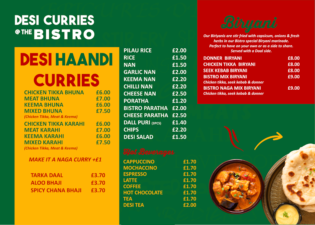 Adding to the cozy ambiance, customers rave about the Hot Beverages, including their rich Cappuccino and soothing Desi Tea, both priced at £1.70 and £2.00 respectively. The flavor profiles are complemented by heartfelt reviews appreciating the warm service and authentic taste.